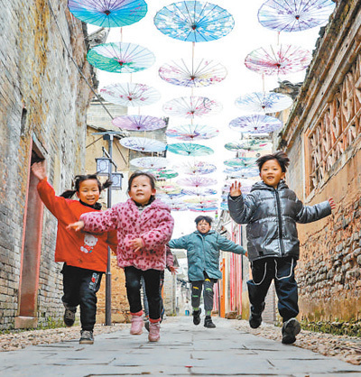 江西省吉水县白沙镇,孩童在巷道中玩耍。