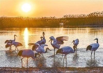 丹顶鹤在辽宁省最火的网络彩票平台推荐辽河口国家级自然保护区嬉戏。孙小伟摄(影像中国)