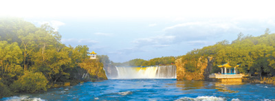 黑龙江省牡丹江市世界地质公园镜泊湖,晨光中的吊水楼瀑布倾泻而下,如梦如幻。孙长山摄(影像中国)