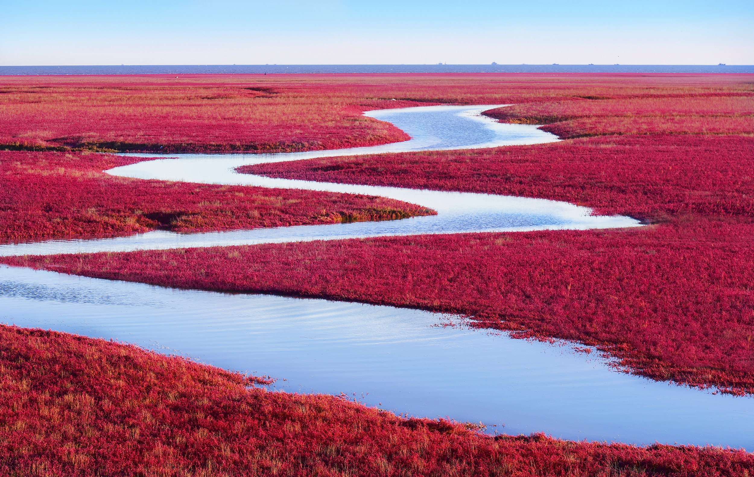近年来,面对碱蓬草明显退化的形势,盘锦文旅集团探索碱蓬草生态保护长效机制,在保证自然资源、湿地生态系统和珍稀动植物不受破坏的前提下,展开大量调研、试验,通过开展潮沟疏浚、储水扩容、碱蓬草种补植、沙蚕和弹涂鱼增殖放流贯通生物洄游通道等办法,开展红海滩湿地修复试验研究,全面强化湿地资源保护。海洋环境及湿地生态系统的有效保护和科学恢复,使红海滩国家风景廊道中的碱蓬草面积从2018年的2000亩增加到2022年的22000亩,盘锦大湿地上最具特色的壮美景观,再次展现在世人面前。