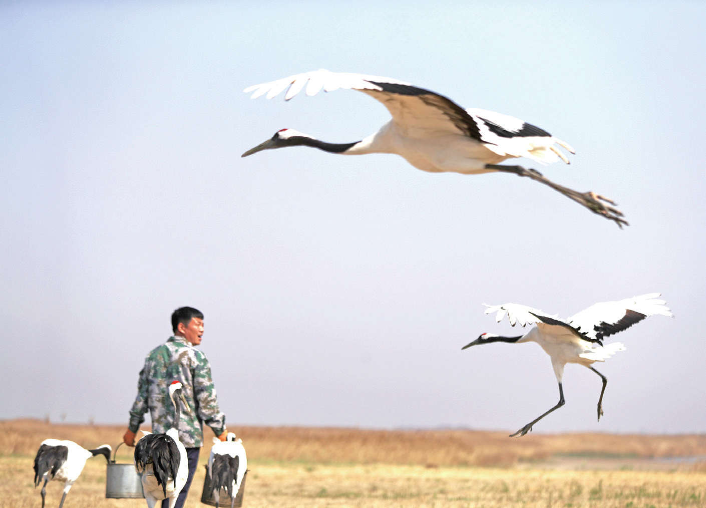 50岁的赵仕伟已经在保护站工作了29年。1997年起,为了照顾幼鹤,他常常不分昼夜,很少回家,婚礼是在鹤站办的,蜜月也是在鹤站度过的,一年在单位得住200多天。在他的努力下,已经有数十只人工饲养的丹顶鹤被放归自然。