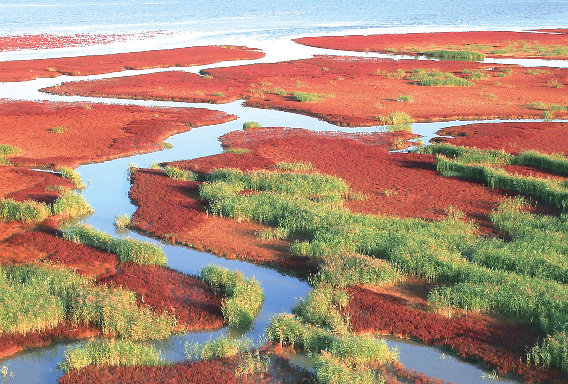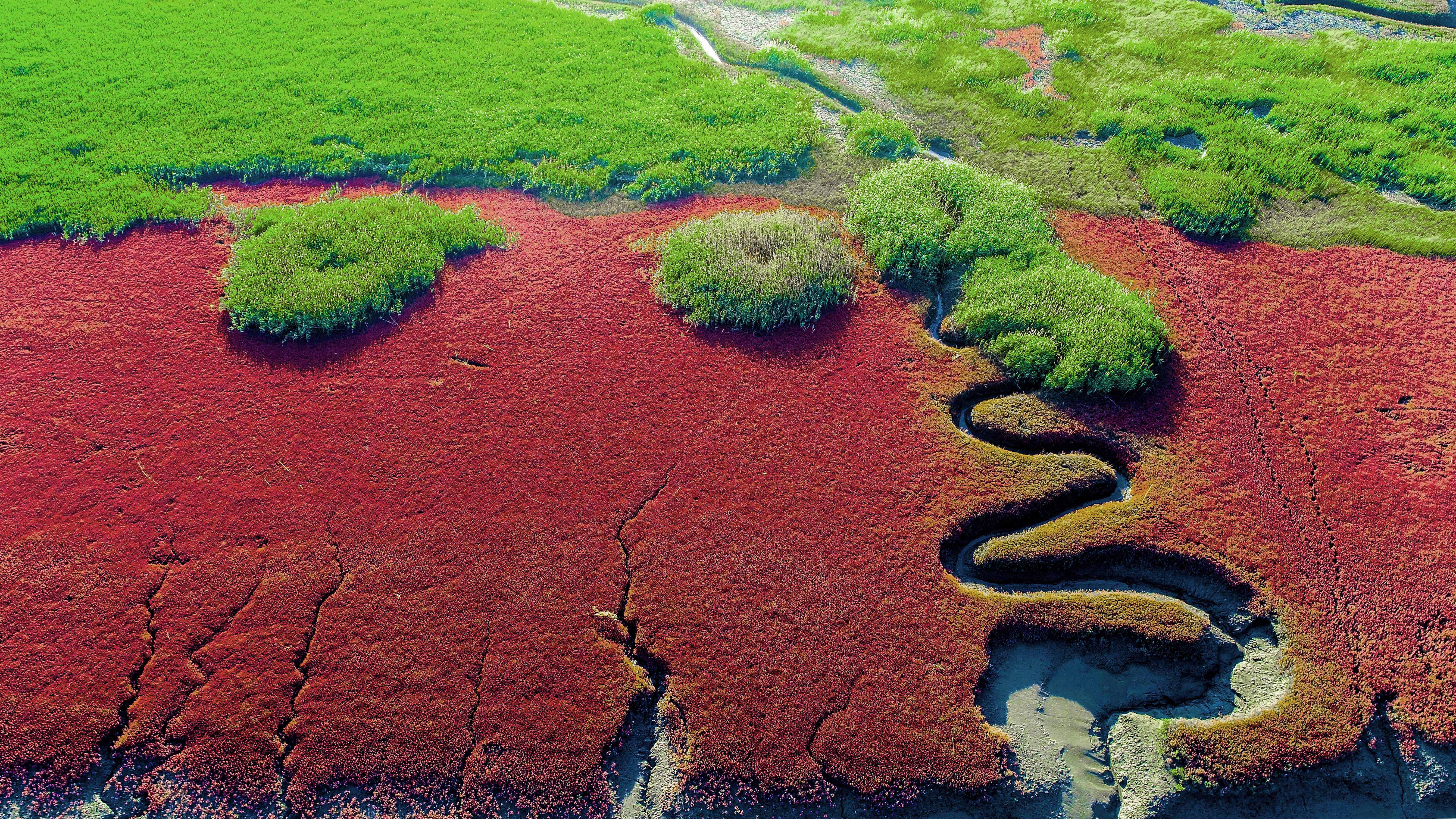 初冬时分,辽宁盘锦,火红的碱蓬草一团团,一簇簇,抱成团,连成片,由近及远舒展开来。微风穿过芦苇的寂静,戏水的鸟群在惬意地展翅、滑翔。