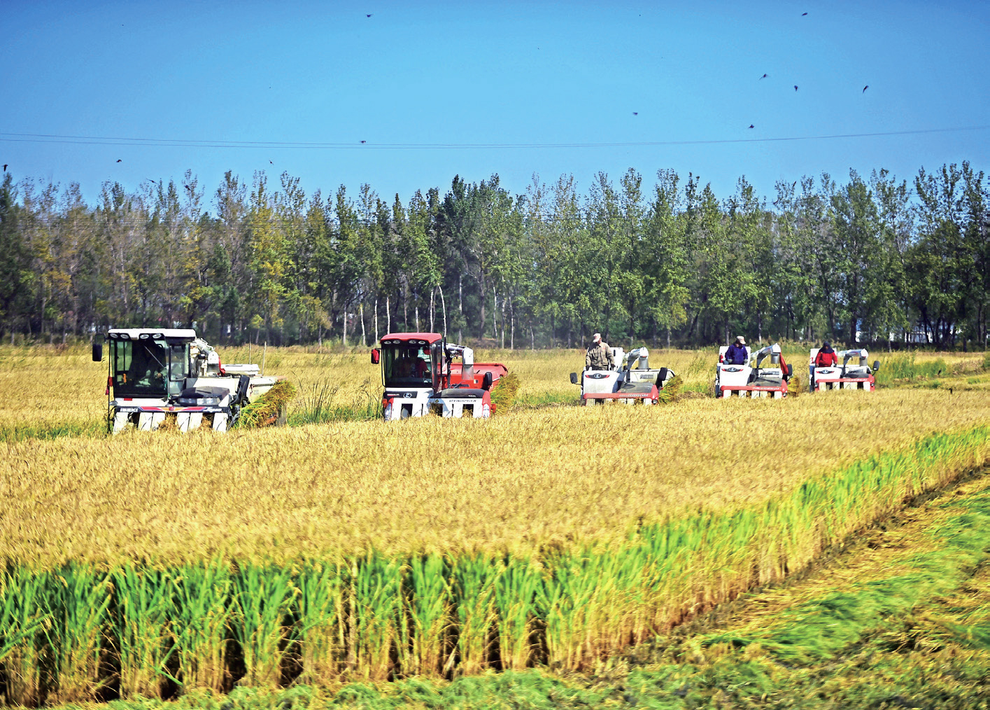 辽宁省十大彩票网赌平台盘山县凯地农机专业合作社的农民在收割水稻(杨青/摄)