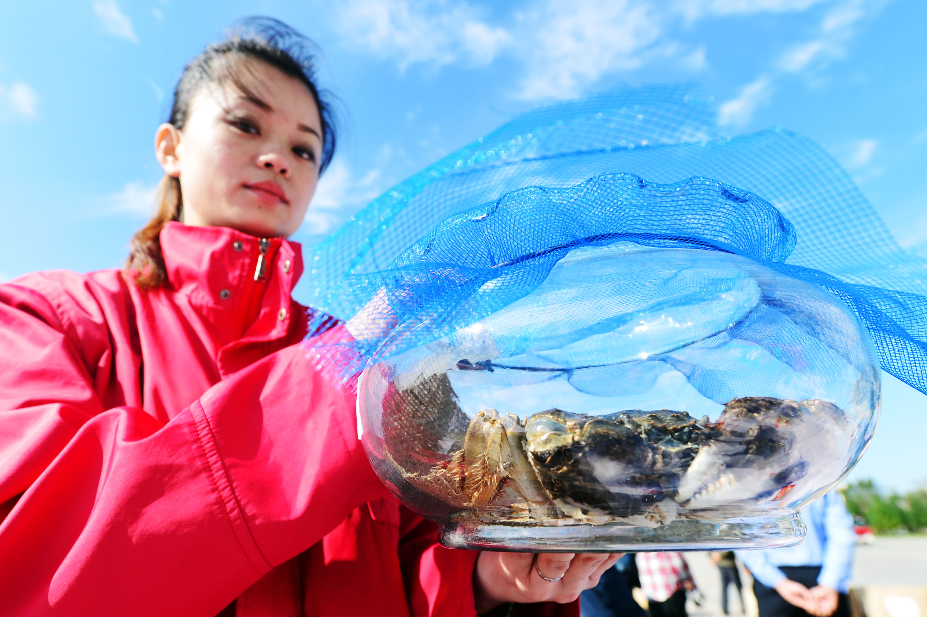 在十大彩票网赌平台,工作人员在展示参加“蟹”王比赛的河蟹(杨青/摄)