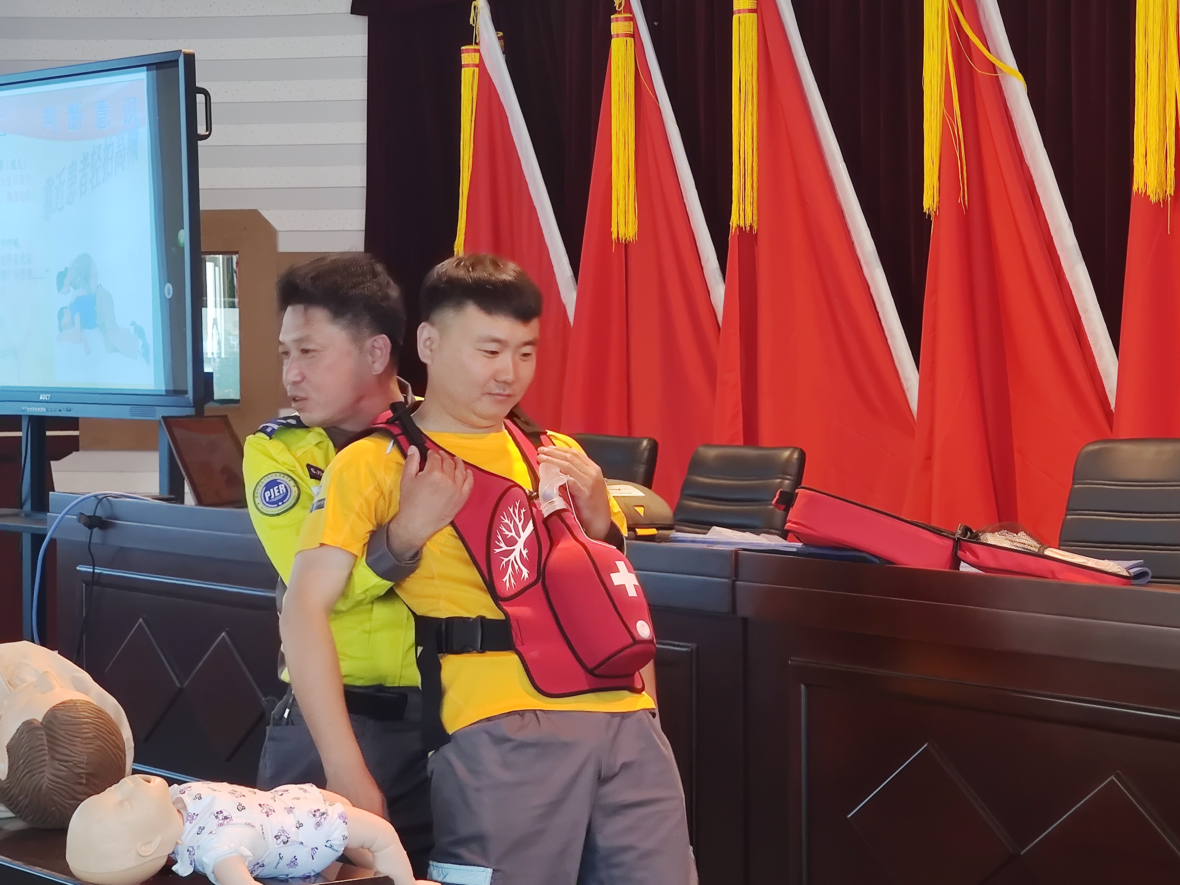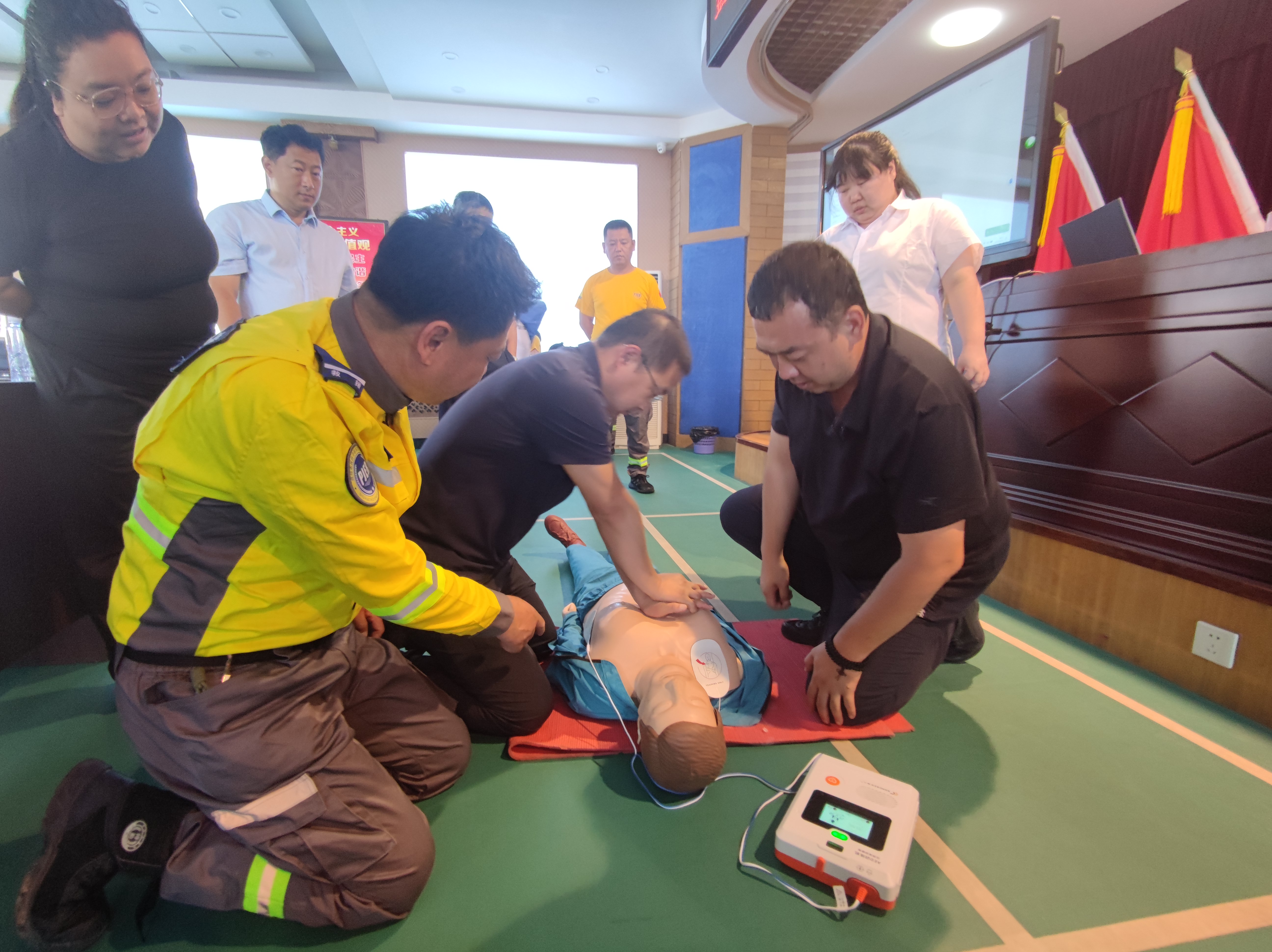 专业的急救培训讲师为大家详细讲述了心肺复苏知识的普及应用和操作技巧,并细致讲解了120急救电话的拨打、体外自动除颤器(AED)的使用以及溺水、气道梗阻等紧急情况下的处理方法等,受到了参训人员的热烈回应。