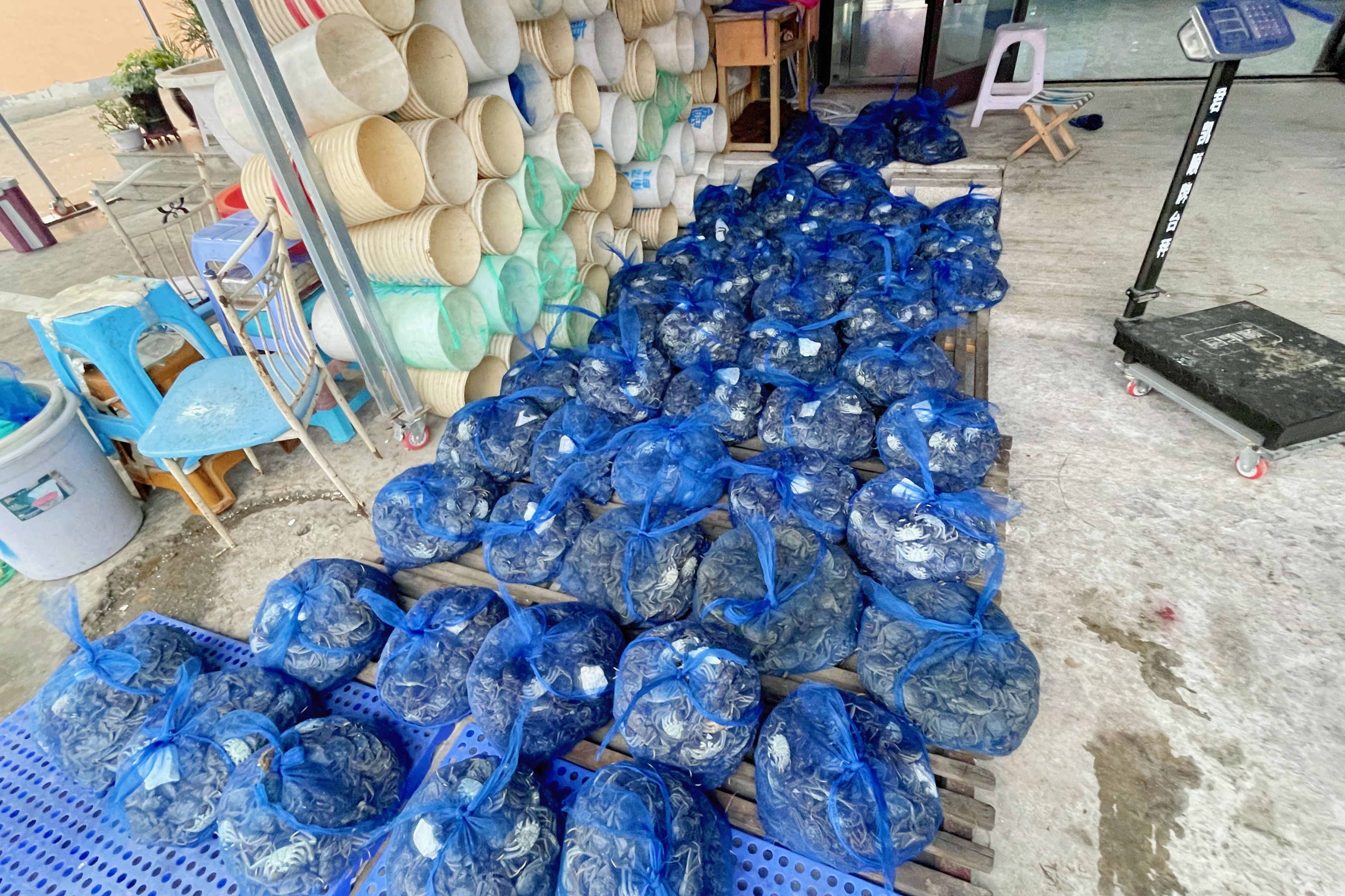 听说记者第一次来到河蟹市场,养蟹大户吴繁亮起了“绝活”。只见她捏住蟹背,收起蟹足,棉绳从河蟹的螯足处起头,先纵向再横向,各绕两圈后系紧,一只张牙舞爪的河蟹便被五花大绑。在河滩地、稻田里长大的吴繁,抓、绑河蟹是她从小练就的本事。