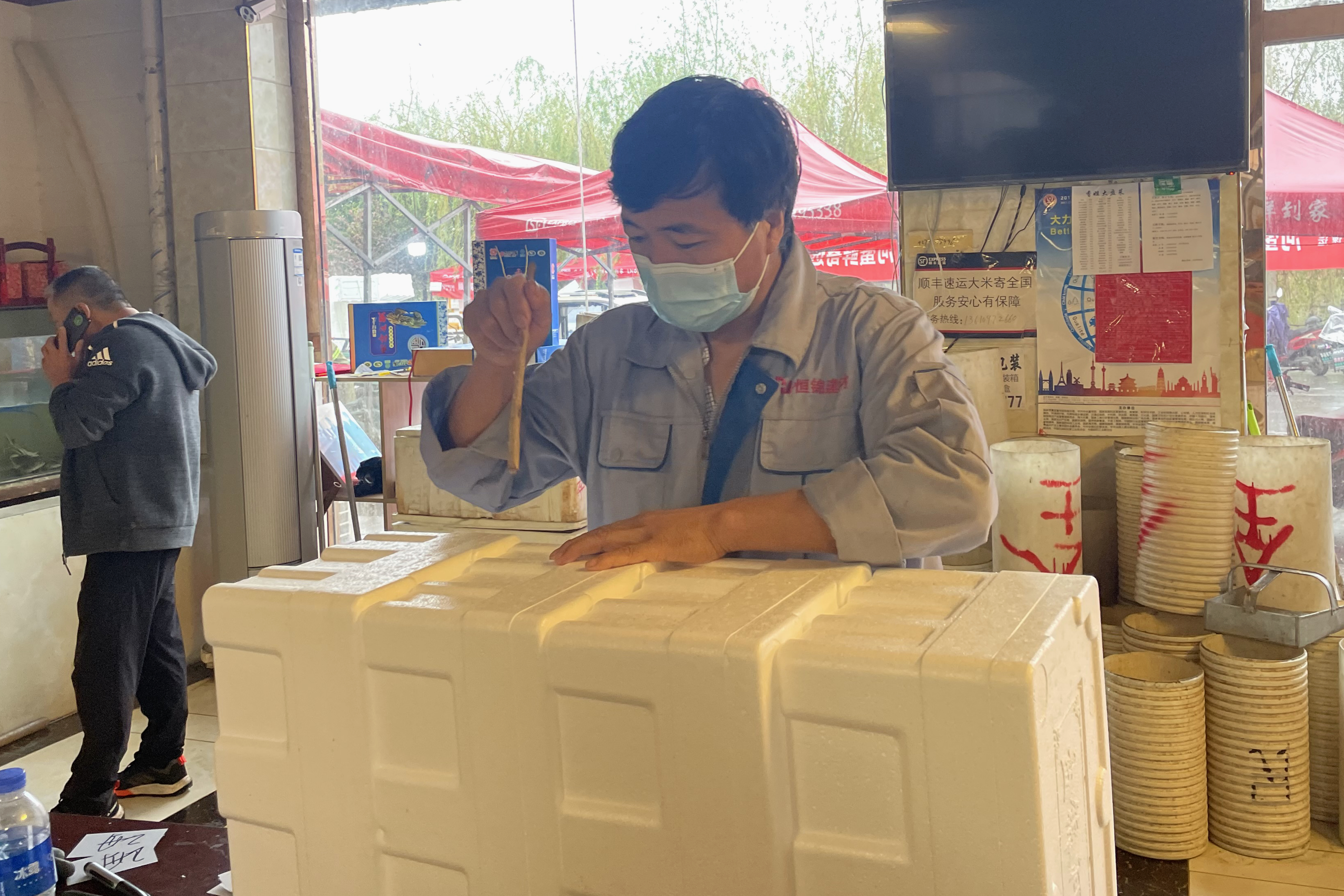 在胡家河蟹市场,商户在为打包好的河蟹盒扎孔。新华社记者武江民 摄