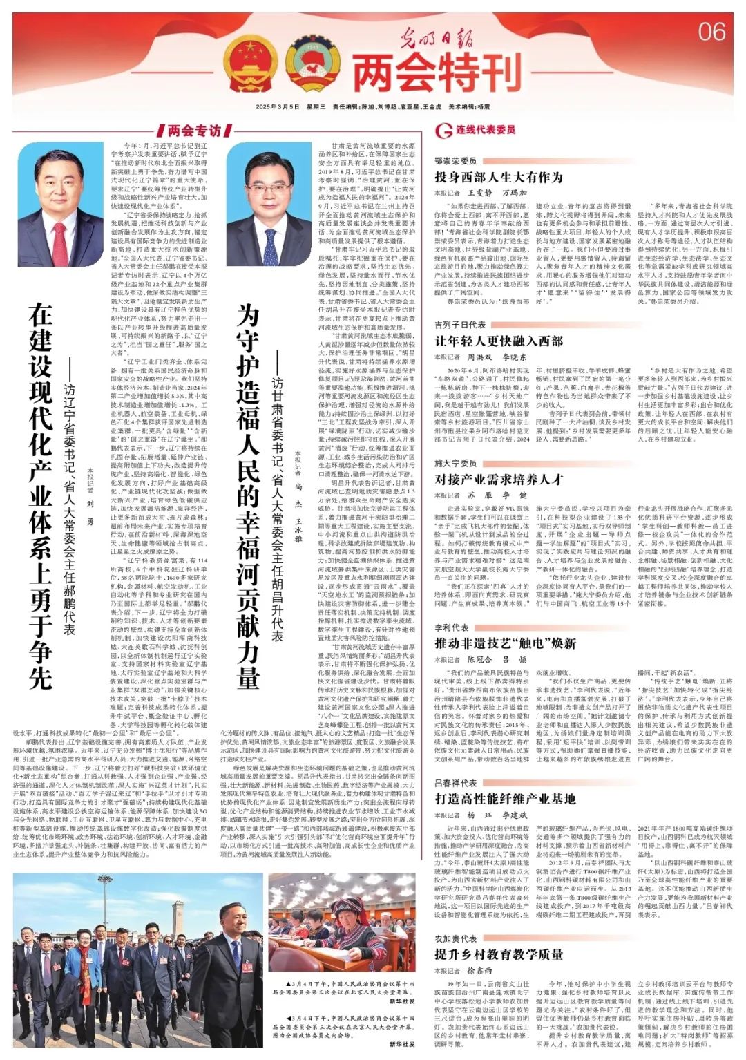 “辽宁工业门类齐全、体系完备,拥有一批关系国民经济命脉和国家安全的战略性产业。我们坚持实体经济为本、制造业当家,2024年第二产业增加值增长5.3%,其中高技术制造业增加值增长11.3%。工业机器人、航空装备、工业母机、绿色石化4个集群获评国家先进制造业集群,一批更具‘含绿量’‘含新量’的‘国之重器’在辽宁诞生。”郝鹏代表表示,下一步,辽宁将持续在巩固存量、拓展增量、延伸产业链、提高附加值上下功夫,改造提升传统产业,坚持高端化、智能化、绿色化发展方向,打好产业基础高级化、产业链现代化攻坚战;做强做大新兴产业,培育绿色低碳供应链,加快发展清洁能源、海洋经济,让更多新苗成大树、连片成森林;超前布局未来产业,实施专项培育行动,在前沿新材料、深海深地空天、生命健康等领域抢占制高点,让星星之火成燎原之势。