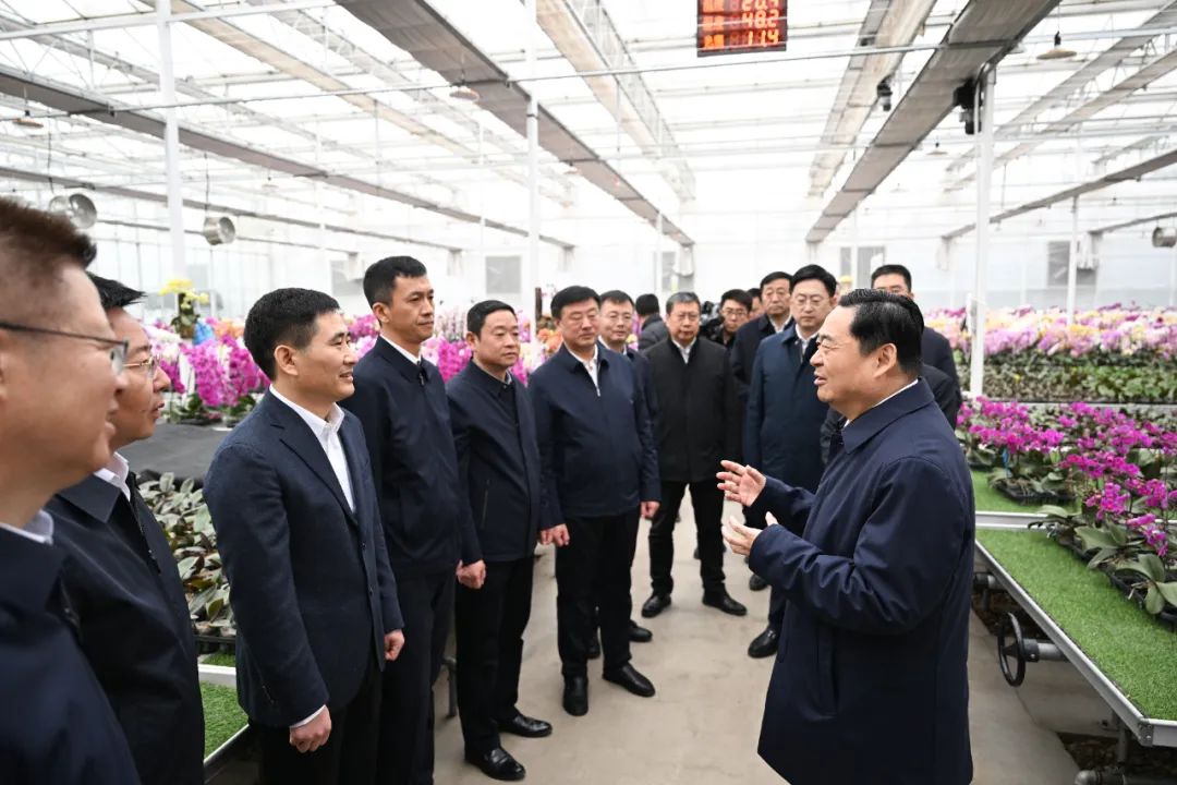 省委书记、省人大常委会主任郝鹏在辽宁东亚种业有限公司温室育种房听取育苗生长等情况介绍。