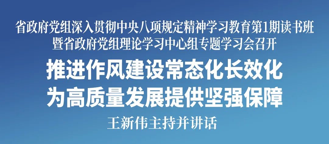 按照党中央部署及省委要求,3月30日,省政府党组召开深入贯彻中央八项规定精神学习教育第1期读书班暨理论学习中心组专题学习会,深入学习习近平总书记关于加强党的作风建设的重要论述,认真学习贯彻中央八项规定及其实施细则精神,推进作风建设常态化长效化,示范引导全省政府系统党员干部锤炼党性、提高思想觉悟,密切党群干群关系,以优良的作风、严明的纪律、争先的干劲,坚决打好打赢三年行动决胜之年决胜之战。省委副书记、代省长、省政府党组书记王新伟主持并讲话。